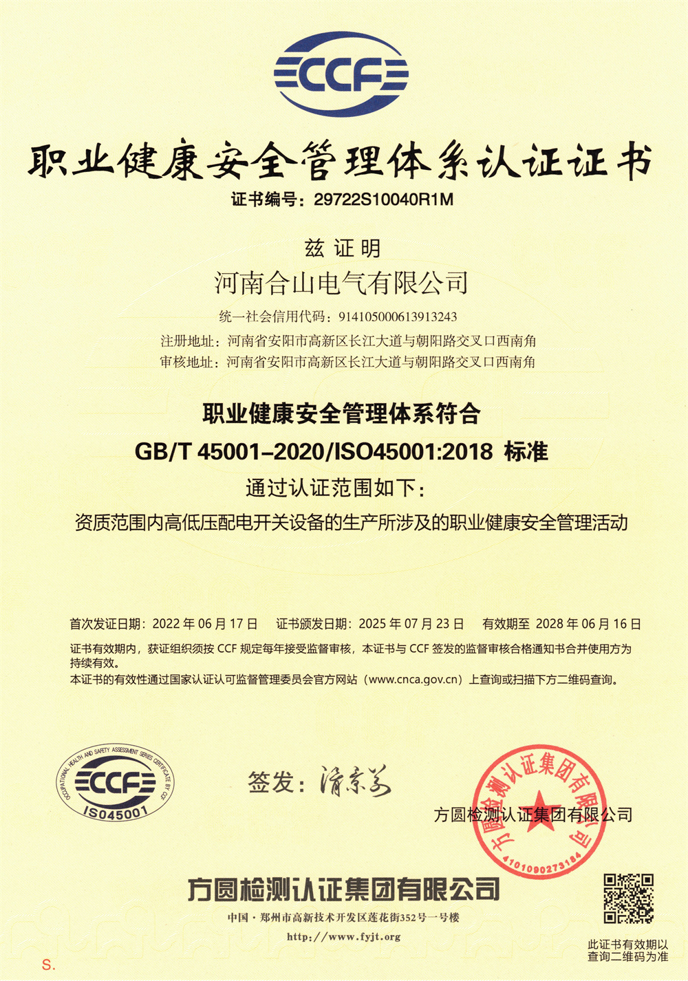 職業健康安全管理體系認證證書